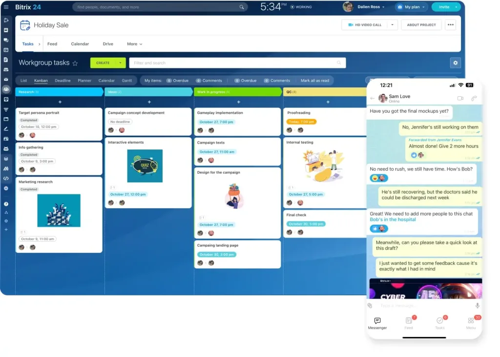 Bitrix24 features everything you need for productive team collaboration and communication: chat, online meetings, tasks, calendar, file storage, online documents, workflow automation, and more.